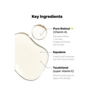 - 0.5% Pure retinol (Vitamin A): Accelerates collagen production and skin cell turnover to reduce fine lines_x000D_