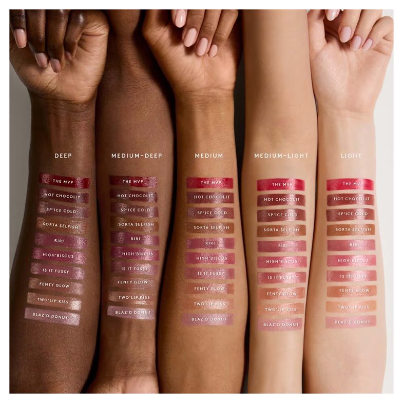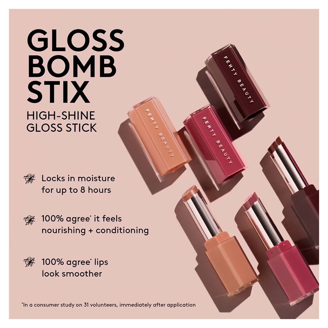 Crave color and comfort in one smooth stroke with the FENTY BEAUTY Gloss Bomb Stix High-Shine Gloss Stick – Is It Fu$$y (3.7 g). This moisture-rich gloss stick glides on smoothly, delivering medium pigment with a luscious, glossy finish. Infused with vitamin E, shea butter, and squalane, the FENTY BEAUTY lip color stick keeps lips soft, nourished, and visibly plump. Also, this non-sticky lipstick hydrates for up to 8 hours, locking in comfort and color all day._x000D_