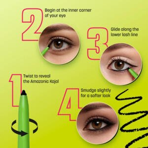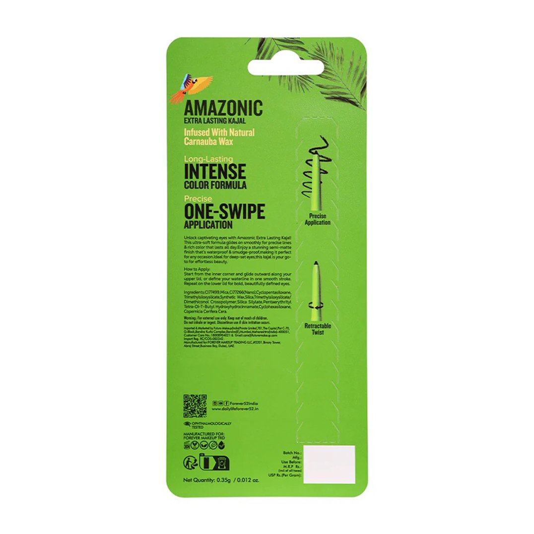 Infused with carnauba wax for a creamy texture, it glides on effortlessly, perfect for creating defined lines or a sultry smokey look. Dermatologically and ophthalmologically tested, Amazonic Kajal is vegan, toxic-free, and gentle for sensitive eyes. Elevate your eye game with every stroke—because your beautiful eyes deserve nothing but the best.