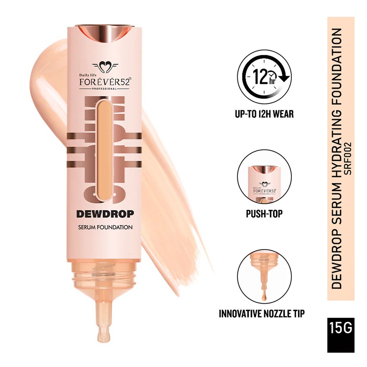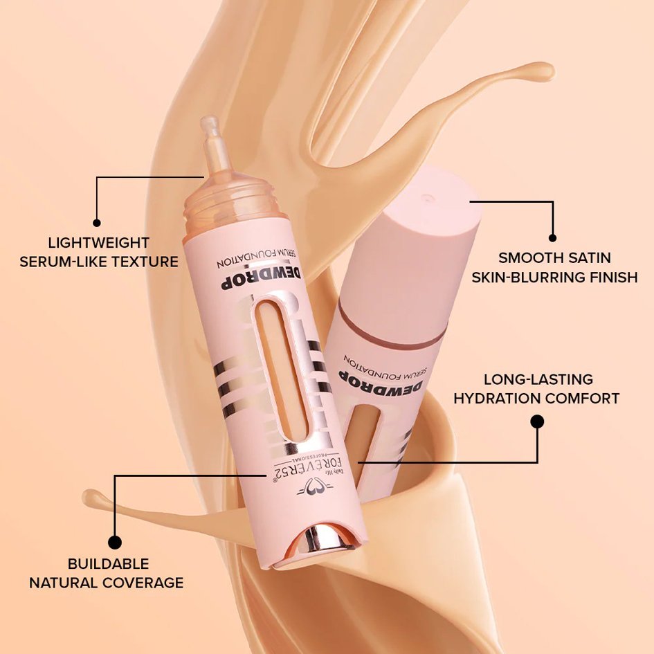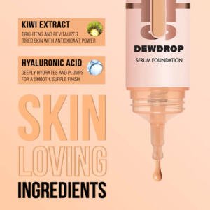 Dewdrop Serum Foundation glides onto skin with a silky, lightweight serum texture to deliver smooth, natural coverage. Formulated with Hyaluronic Acid to deeply hydrate and plump, and Kiwi Extract to help brighten and boost radiance, it visibly blurs imperfections, redness, and uneven tone. The satin finish mimics real skin, leaving a fresh, flawless second-skin look that stays comfortable for up to 12 hours.