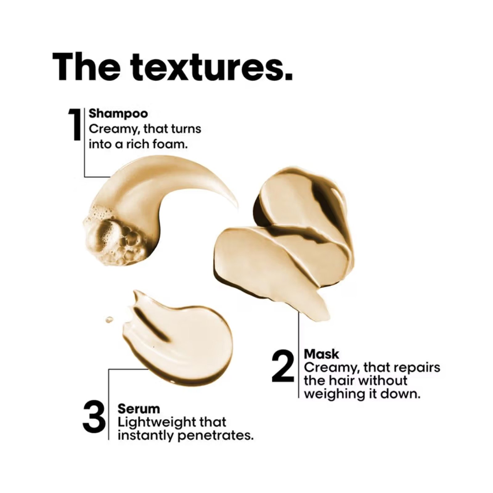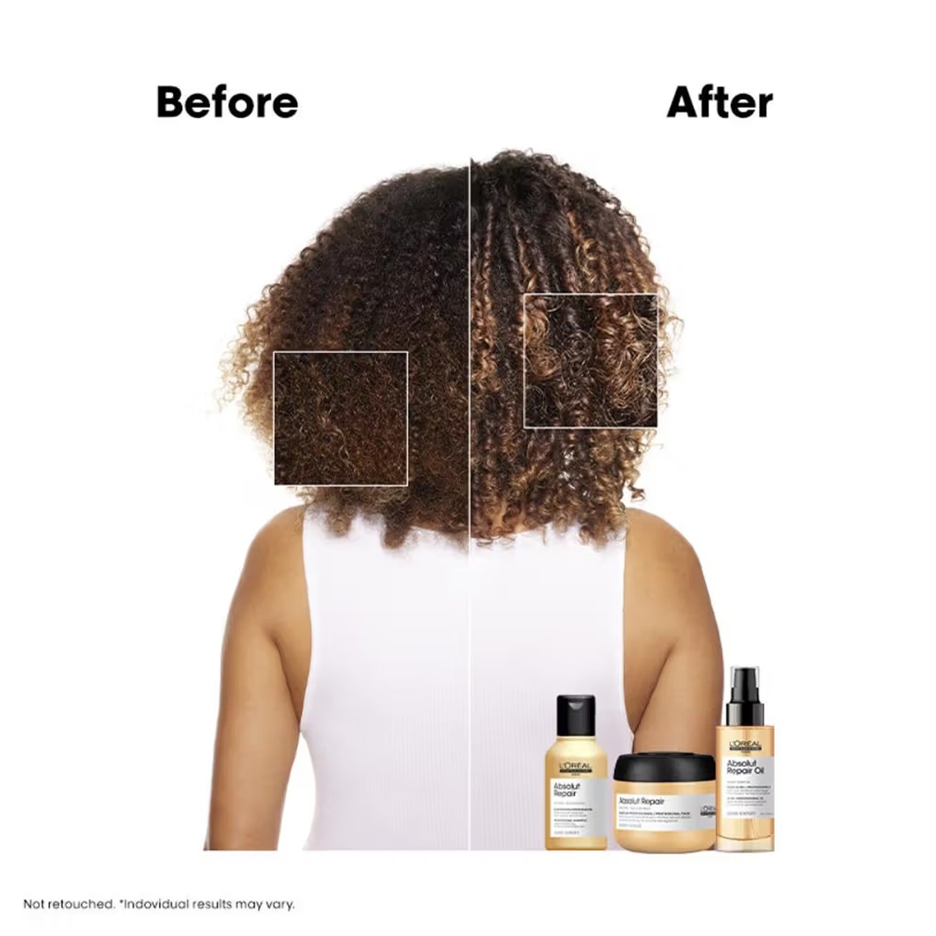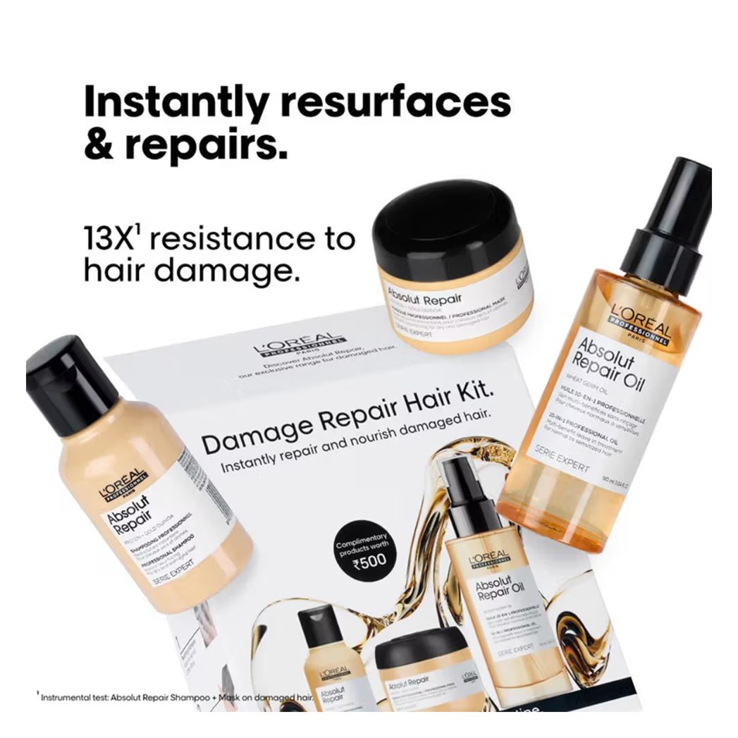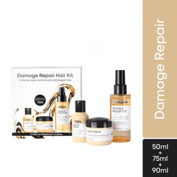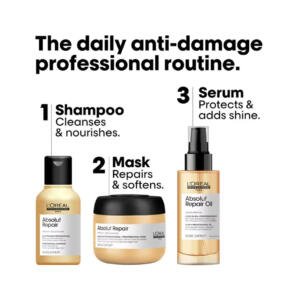 L’Oréal Professionnel Damage Repair Hair Kit with the Absolut Repair 3-Step Regime is designed to deeply nourish and restore damaged hair. Powered by protein and omega-9, this expert trio strengthens hair fibers and improves texture, softness, and hydration.
