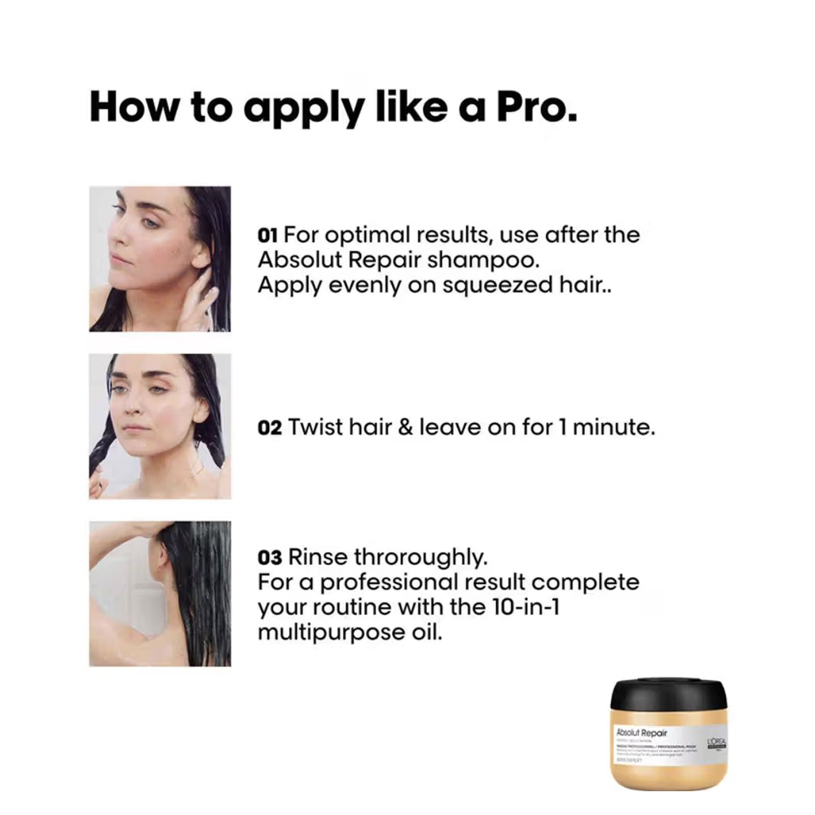 - L’Oréal Professionnel Absolut Repair Mask: Apply to towel dried hair. Leave in for 3-5 minutes. Rinse thoroughly.
