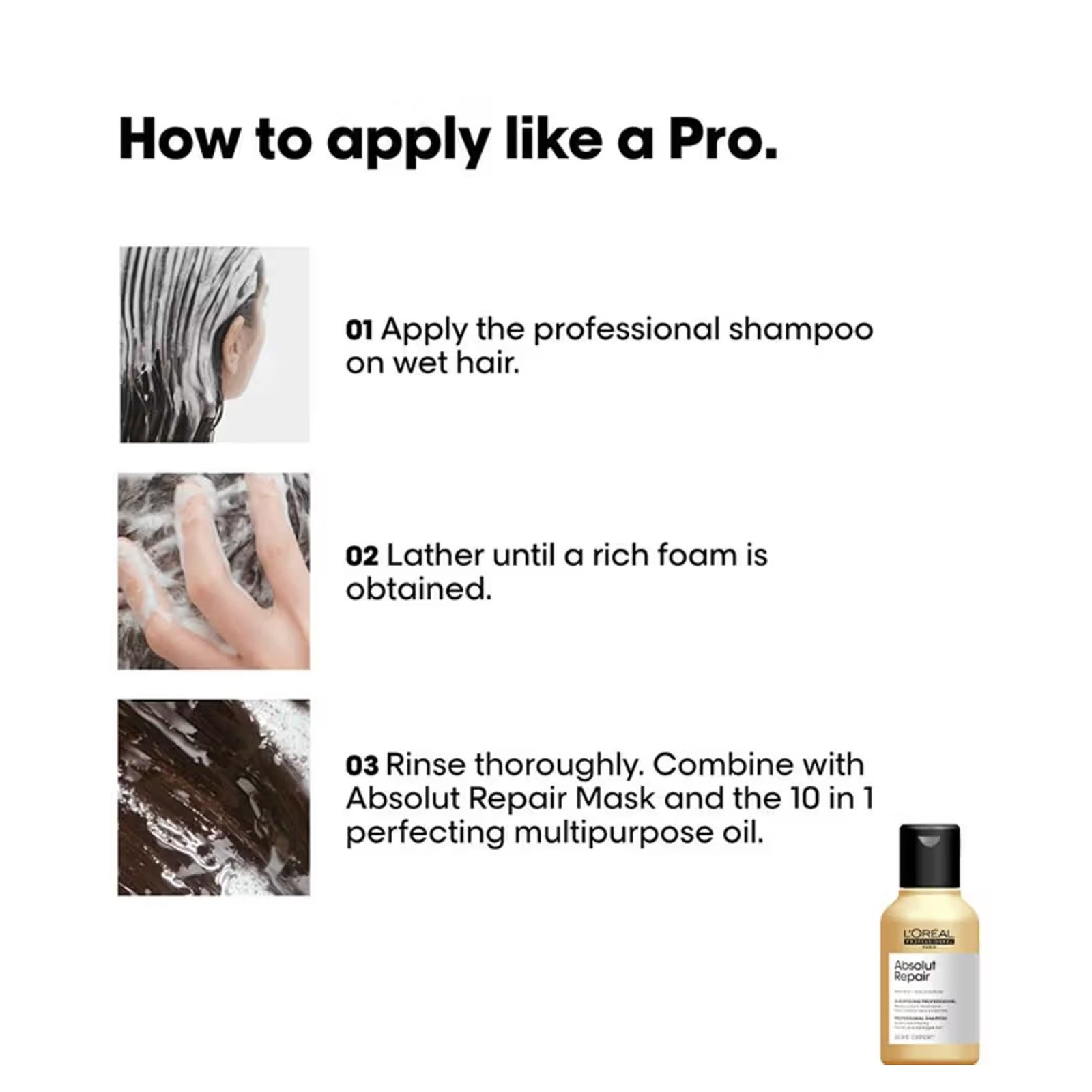- L’Oréal Professionnel Absolut Repair Shampoo: Apply shampoo on wet hair until rich foam is obtained. Rinse thoroughly.