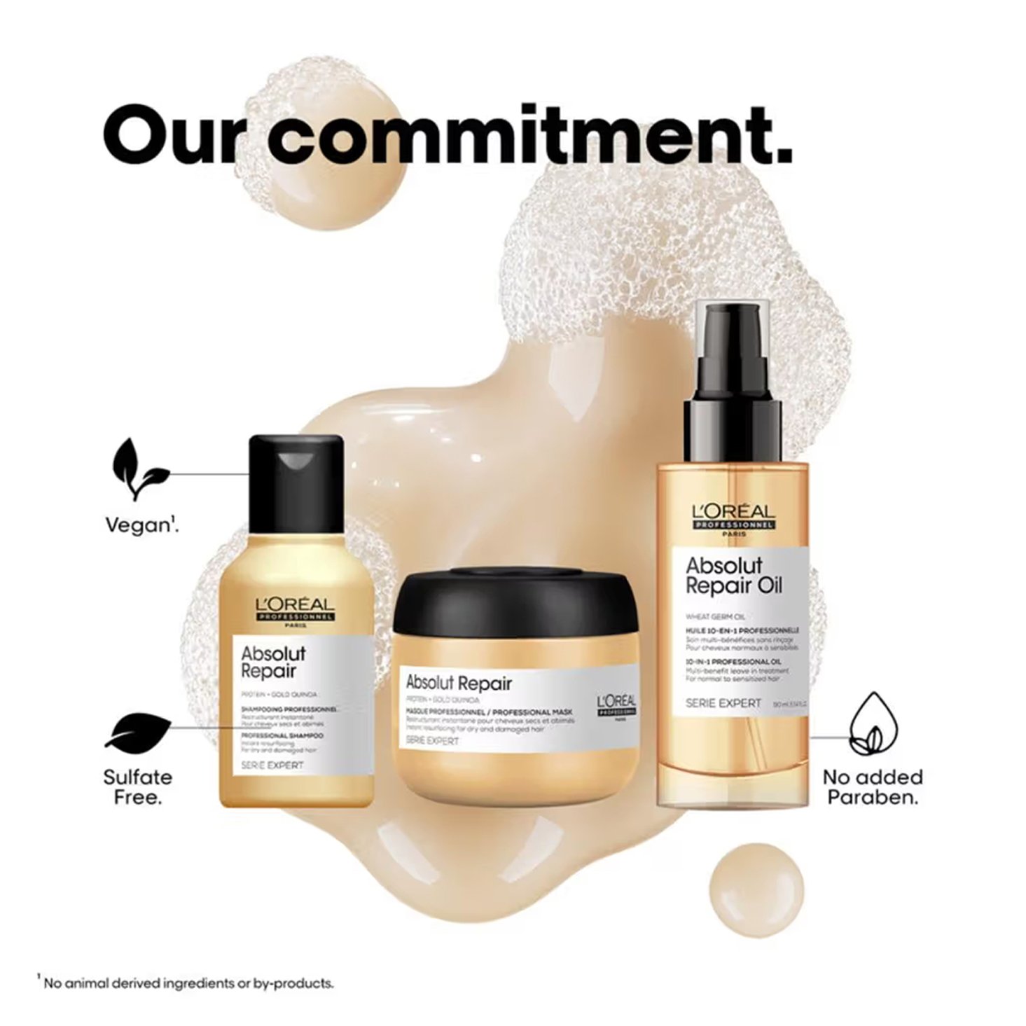 - 1 x L’Oréal Professionnel Absolut Repair Hair Serum (90 ml): 10-in-1 multipurpose treatment oil for damage repair. Multi-Benefit Treatment:1-nourishment 2-resurfacing 3-lightweight touch 4-softness 5-detangling 6-conditioning 7-manageability 8-shine 9-protection 10-smoothness