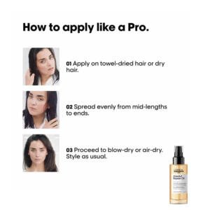 - L’Oréal Professionnel Absolut Repair Hair Serum: Apply a small amount to towel-dried hair. Spread evenly through mid-lengths and ends. Do not rinse. Style as usual.
