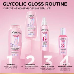- Laminate hair cuticles with the new L’Oréal Paris Glycolic Gloss Shine Sealing Conditioner, to seal the shine