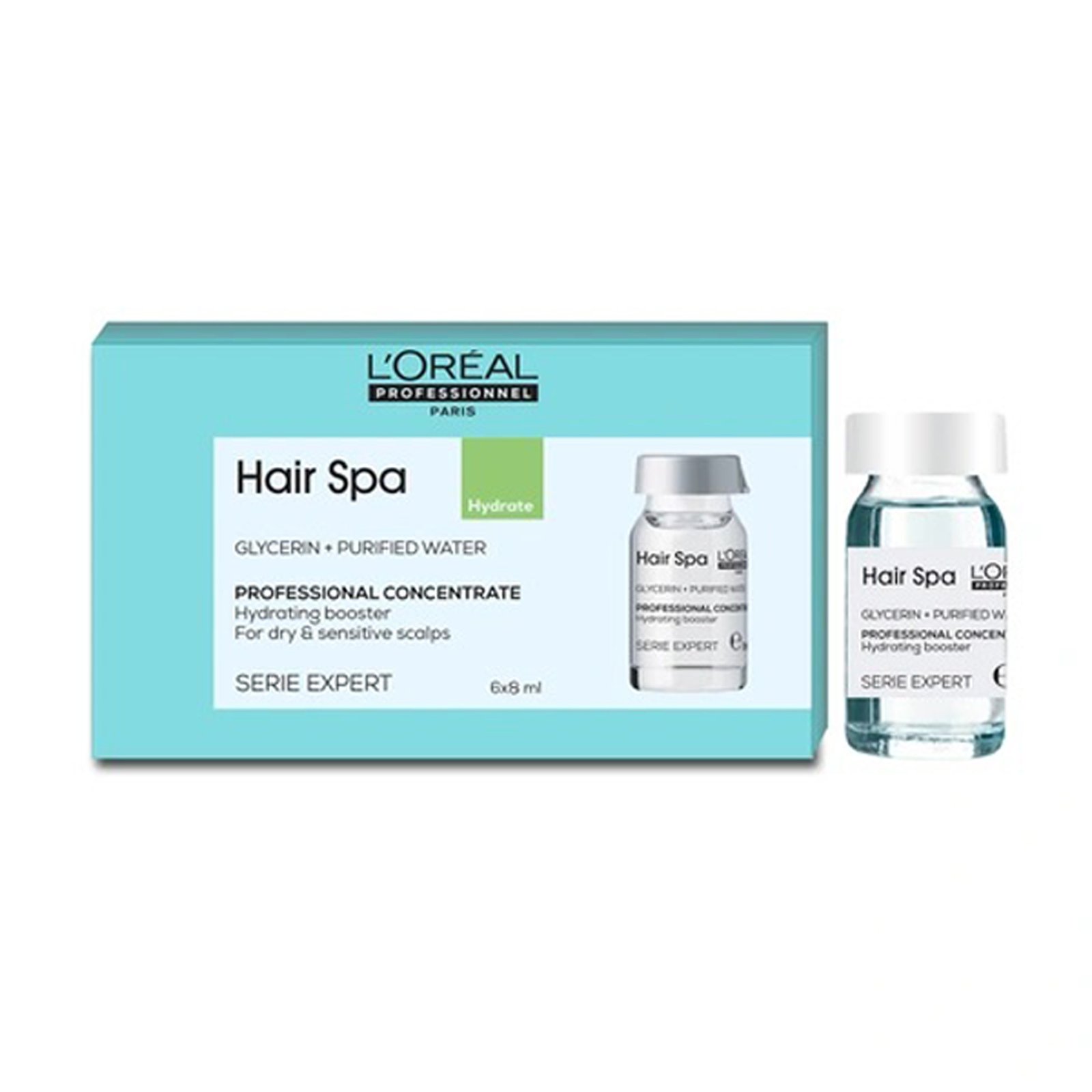 The Loreal Professionnel Hair Spa Hydrating Concentrate (8ml x 6) is an intensive treatment designed to deeply nourish and hydrate dry, dull, and damaged hair. This professional-grade concentrate is enriched with water lily and essential nutrients that penetrate deep into the hair fibers, restoring moisture and leaving hair soft, smooth, and revitalized. Perfect for restoring balance and shine to parched hair, it enhances manageability and reduces frizz. The compact 8ml ampoules make it ideal for targeted treatment, offering salon-like results at home or in the salon. It�s an essential solution for anyone seeking intense hydration and long-lasting moisture for their hair.