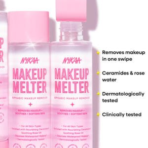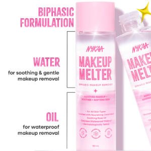 Nykaa Makeup Melter Biphasic Makeup Remover is your ultimate go-to for effortless, skin-loving makeup removal. This dual-phase formula is powered by a lightweight oil and water blend that melts away even the most stubborn waterproof makeup – including long-wear foundation, mascara, and matte lipsticks – without tugging or irritating your skin.Infused with nourishing ingredients, it not only cleanses but also hydrates and soothes, leaving your skin feeling soft, refreshed, and residue-free. Shake well before use to activate the two phases, then sweep across your face with a cotton pad for instantly clean and comfortable skin.